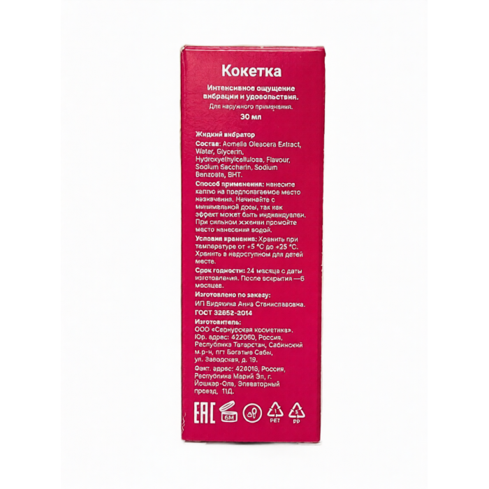 "Кокетка Вибро" - это must-have для каждой современной женщины! Этот чувственный интимный натуральный гель, создан для того, чтобы разжечь искру желания и подарить невероятные, захватывающие ощущения. Наша инновационная формула обеспечивает деликатное покалывание, пробуждая самые сокровенные места и превращая каждое прикосновение в феерию чувств.
